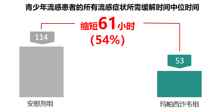 臨牀(chuang)III期中(zhong)青少年(nian)流感患者的(de)所有(yǒu)流感症狀緩解時間中(zhong)位數(shu):