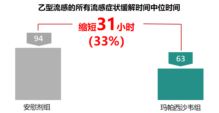 瑪帕西沙韋對比安(an)慰劑縮短31h(63.3h vs 94.3h),有(yǒu)統計(ji)學(xué)差(cha)異(p<0.05)