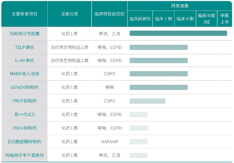 From the perspective of innovation-driven strategic depth, focusing on the respiratory field, HealthGen currently has 11 Class 1 innovative drug products in reserve. Among these, in addition to Mapasibave Capsules, which have entered the final stages of market launch, TSLP monoclonal antibody, IL-4R monoclonal antibody, MABA inhalation solution, and GSNOR inhibitor have all entered Phase II clinical trials.